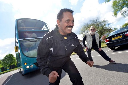 Manjit Singh, a 66-year-old grandad has broken his 57th world record after towing a 12-tonne double-decker bus - with nothing more than his tiny ponytail.