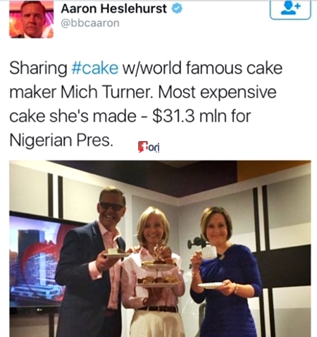 BBC World News anchor and World Business Report presenter, Aaron Heslehurst, has set the Nigerian social media buzzing with comments of mixed reactions and criticisms after he tweeted that a Nigerian president ordered a cake from world famous cake designer for a whooping $31.3 million.